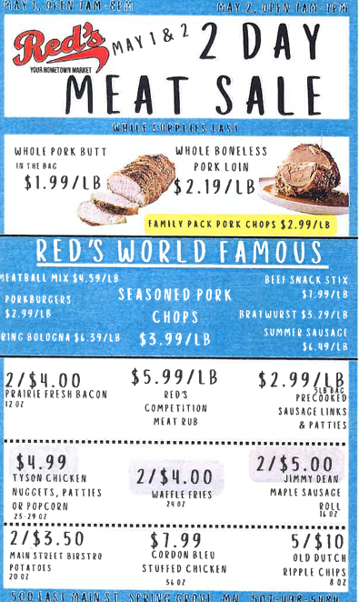 Our Spring Meat Sale is scheduled for Friday May 1st and Saturday May 2nd. The sale ad is posted below.